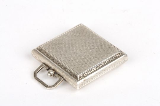 An early 20th century Eszera Continental silver folding travelling watch the square dial with Arabic numerals and subsidiary seconds dial, in an engine turned square case marked 935, 4 cm wide.Condition: Some marks to dial, appears to be in working order, generally good condition.