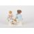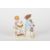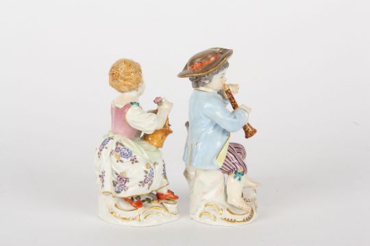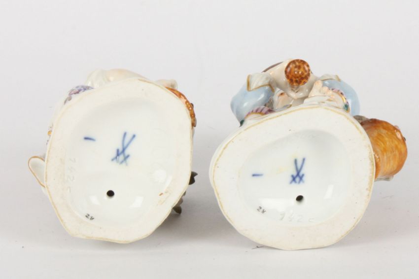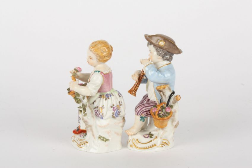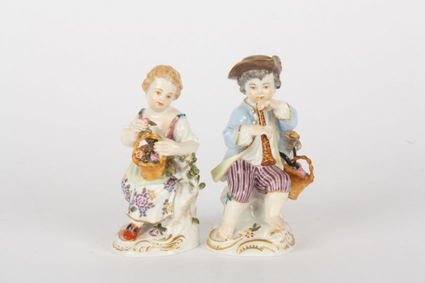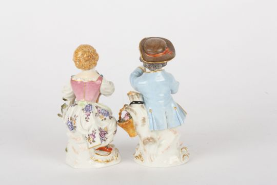 Pair of late 20th Meissen figures, modelled as gardening boy with trumpet and gardening girl with basket of flowers, each standing on a gilt rococo base, painted blue cross sword marks and impressed and incised numerals, 11cms and 10.5cms.Condition: Good condition
