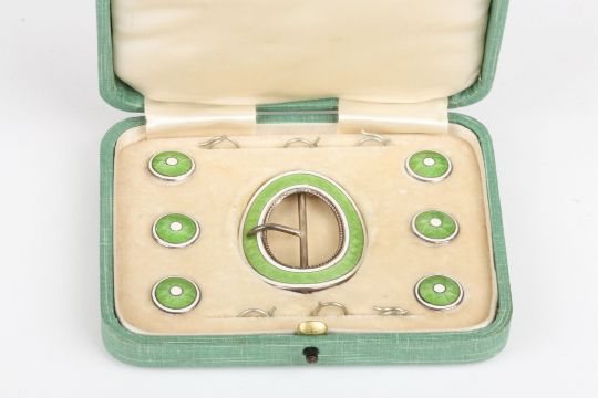 An Edwardian silver and enamel buckle and button set hallmarked Birmingham 1910, the oval buckle and round buttons decorated with green and white enamel in a fitted case. Makers mark: Levi & Salaman, Condition: Good condition