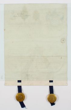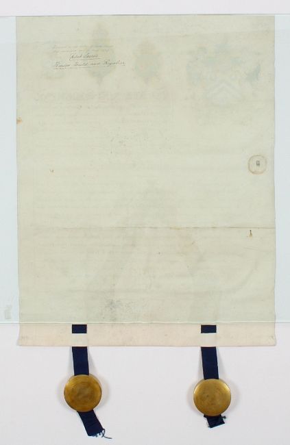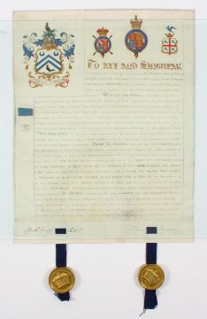 A Victorian armorial Coat of Arms indenture to Sir Charles George Young Knight Garter, dated 1859, together with attached wax seals of the crest, Condition: Some tarnish, otherwise good condition.