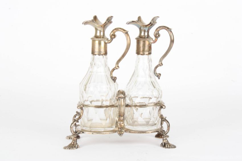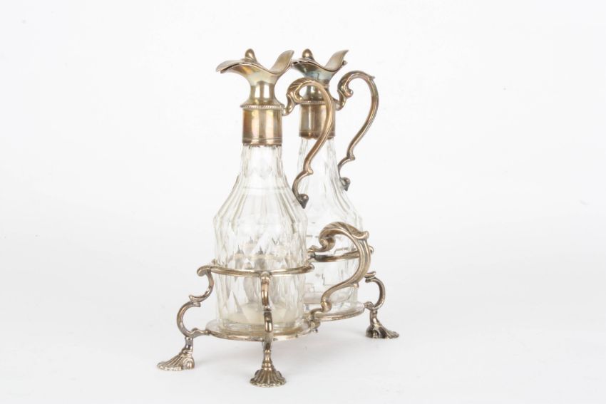 A George II silver decanter stand hallmarked London 1755 with initials SW probably for Samuel Wood, with scroll handle, shell shaped feet and decorative cartouche to the front, with later silver plated and glass decanters, height 21.5cmCondition: Apart from later decanters, appears to be in original condition