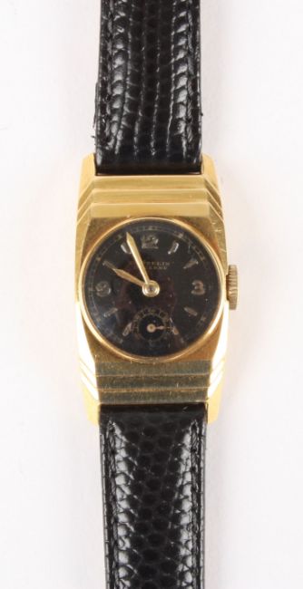 An E. Gübelin 18ct gold Art Deco design dress wrist watch the black dial signed E. Gübelin Lucernce with baton and Arabic numerals, and subsidiary seconds dial, in a stepped 18ct gold case, marked .750, number 441656 2207. The case back with engraved name, on a black leather strap. In original box, Case 20mm wide.Condition: In good cosmetic condition, tiny chip to dial by seconds subdial, hands set, but movement does not run, appears fully wound.