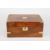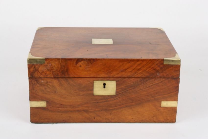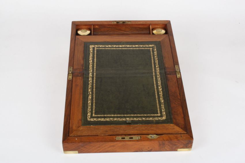 A mahogany writing slope with brass bound edges and blank cartouche to the lid and escutcheon, with two brass lidded glass inkwells, width 30cmCondition: Overall in good condition. The tooled leather writing slope possibly later although fits well.