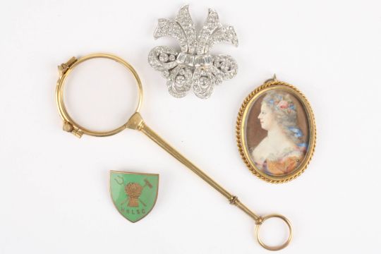 A small group of objets d'art comprising an oval portrait miniature, a paste clip brooch, an enamel badge and a gilt metal lorgnette. (4), Condition: No damage.