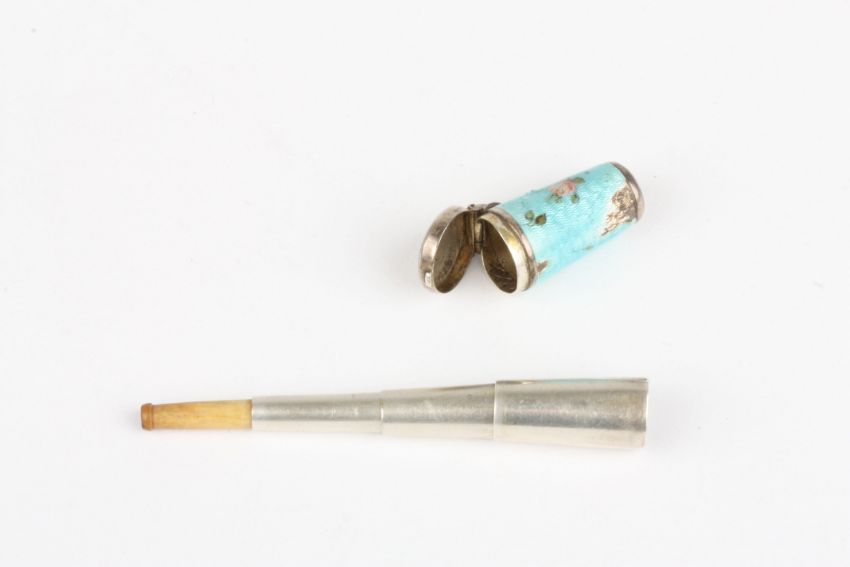 A small early 20th century Continental and enamel silver cased collapsable cheroot holder, 2.5 cm long.Condition: Some enamel chips to the case.