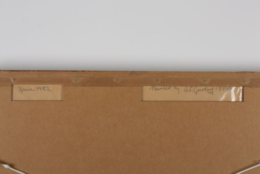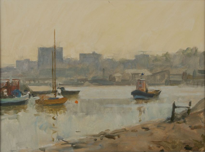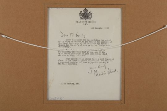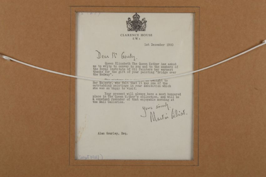 Alan Stenhouse Gourley (British 1909-1991) River scene 1982, oil on board, signed in the bottom right in pencil, framed together with another by the same hand the second painting entitled "Bridge over the Meadway' with a copy of letter from Clarence House to the artist showing the Queens Mothers appreciation for the artist (2), 29 x 38xmCondition: Both in good condition