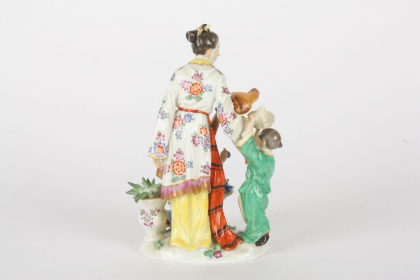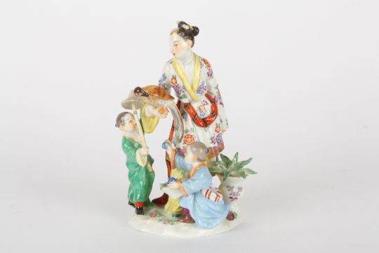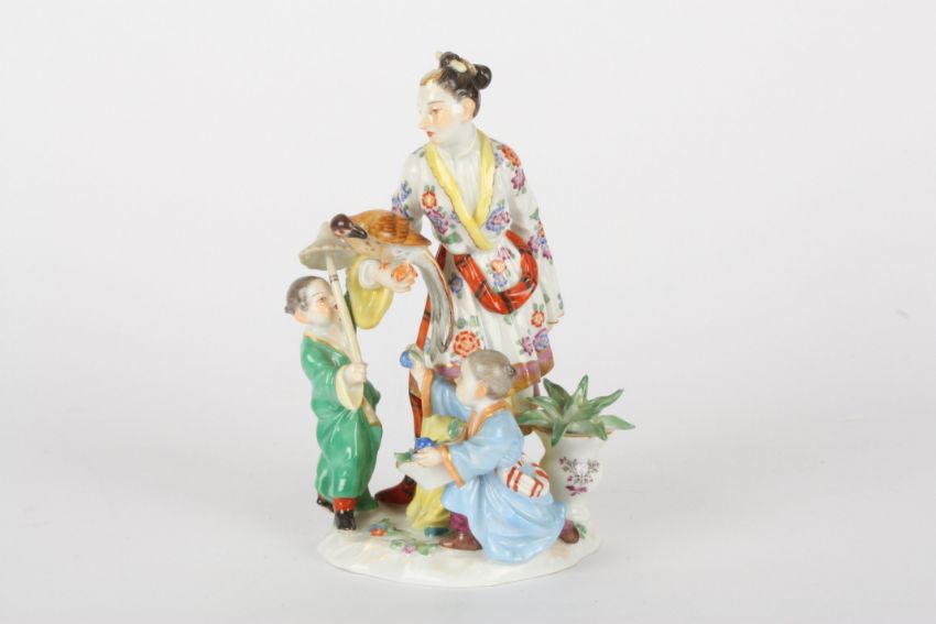 Late 20th century Meissen figure group, after Kaendler, modelled as a Japanese lady with two children and a Parrot, painted blue cross swords and impressed and incised marks 122 and 65648, 17 cms highCondition: minute chip to end of leaf in vase and to leaf of other blue fruit.