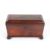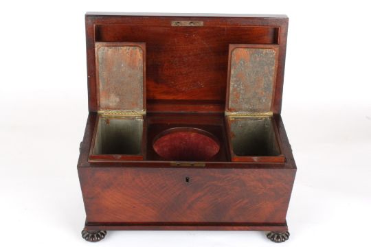 A large Regency flame mahogany sarcophagus shaped tea caddy, with a pair of bronze wreath handles and supported on reeded bun feet, the top opening to reveal two lidded boxes and a mixing well, 36 cm wide.Condition: Good condition, minor veneer nicks.