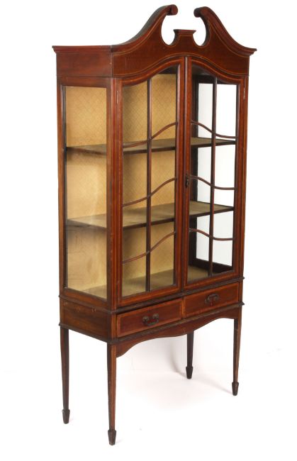 An Edwardian mahogany display cabinet the two glazed front doors opening to reveal two shelves above two drawers, with satinwood inlay and swan neck pediment, raised on squared tapering legs, height 185cm width 87cm Condition: