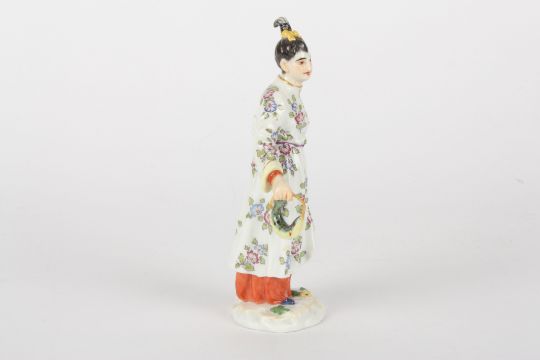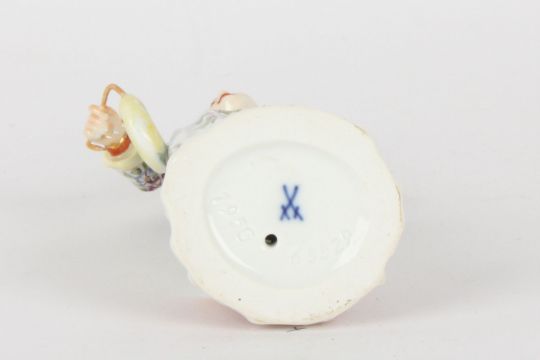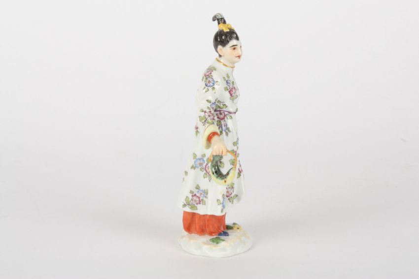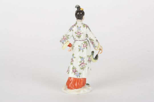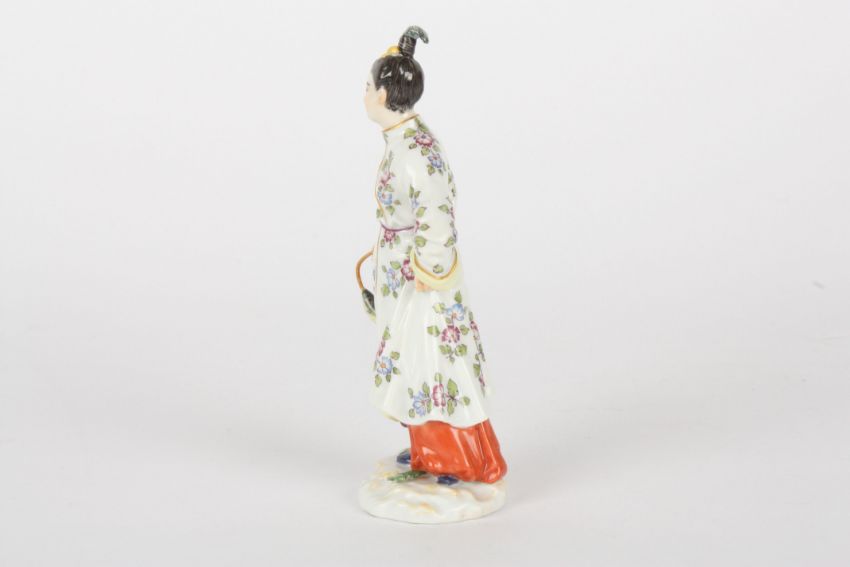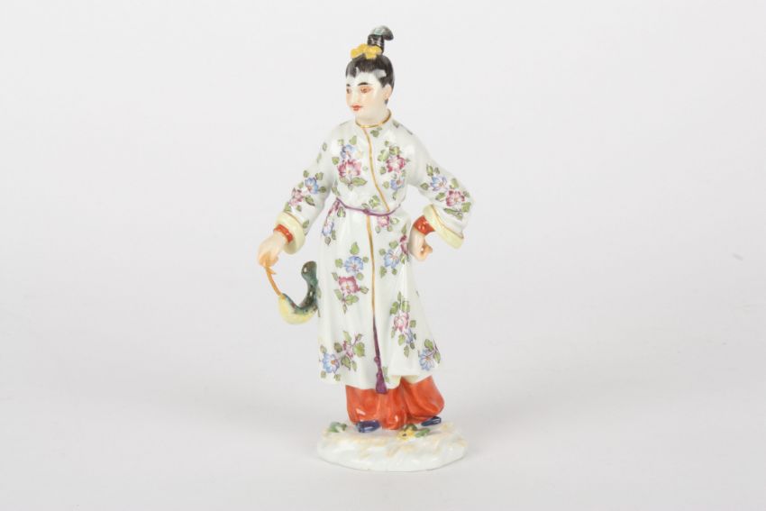 Late 20th century Meissen figure, unknown designer, modelled as Japanese lady standing with a fish on line, painted blue cross swords marks, impressed and incised mark, 13.5 cms high Condition: Good condition