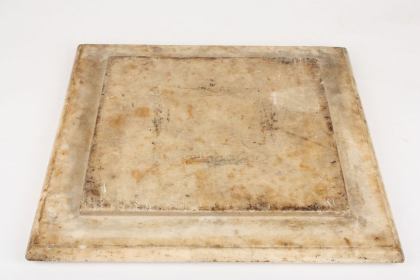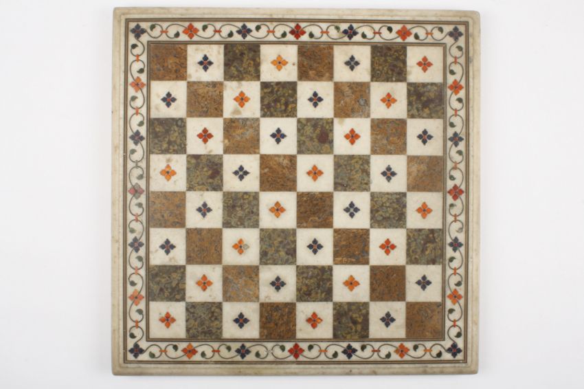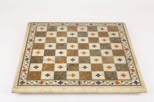 A 19th century Italian pietra dura chess board of square form inlaid with decorative floral motifs and scrolls, 43cm squareCondition: One petal missing from the flowers on the squares and three flower centre dots, and five small inserts from the border missing as per the photos. Otherwise in good condition.