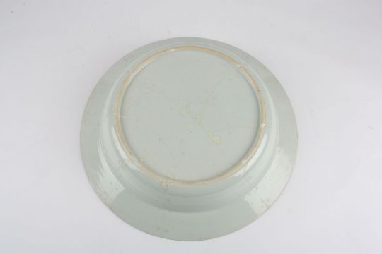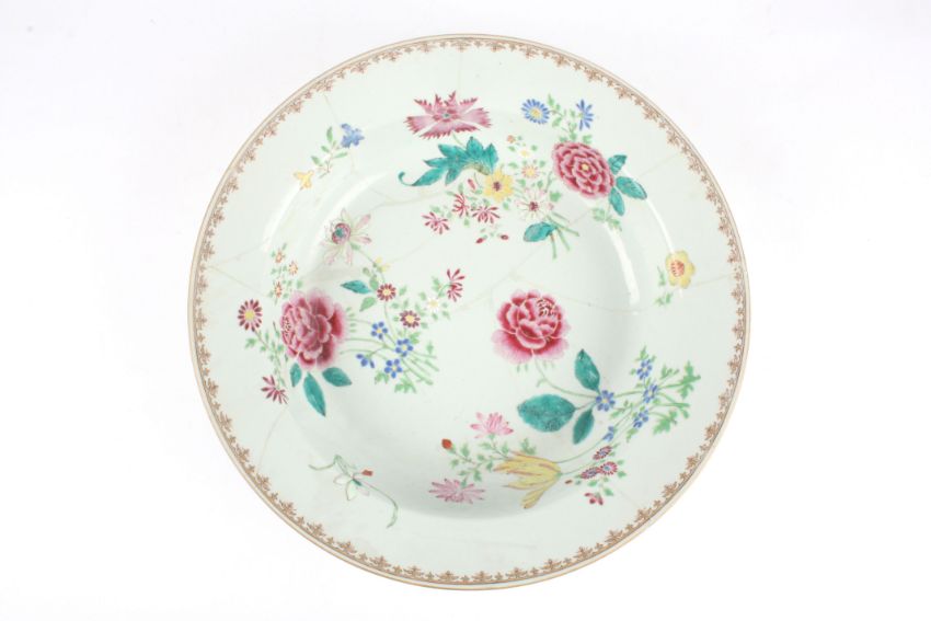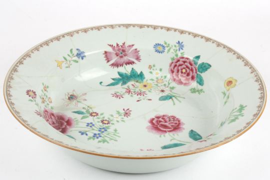 A large early 19th century Chinese porcelain Famille Rose deep dish painted with vignettes of bright pink flowers and leaves, with plain exterior, unmarked, 38 cm diameter.Condition: Heavily cracked and repaired with old rivet type and the rivets later removed.Provenance: Heavily cracked and repaired with old rivet type and the rivets later removed.