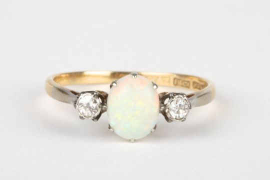 An opal and diamond three stone ring set with central oval opal of good colour, flanked by small diamond weighing approx 0.06cts each, set in 18ct gold and platinum, Size R 1/2Condition: Good condition
