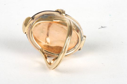 A large Victorian cabochon amethyst and diamond ring set with a large oval cabochon amethyst measuring 23 x 18 mm, in a four claw mount, each claw set with a diamond, in an unmarked gold mount, Size P.Condition: Good condition