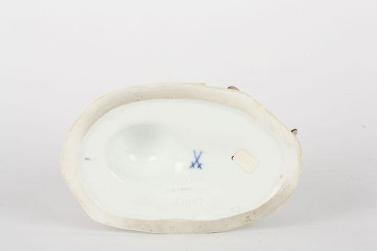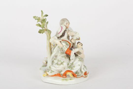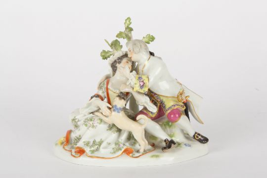 Late 20th century Meissen figure group, after Kaendler, courting couple seated, with a playful Pug dog, blue painted cross swords, impressed and incised numerals 133D and 73097, 15.5 cms longCondition: one leaf chipped to tree at back. The ladies right arm is broken just beneath the shoulder (clean break) and broken fingertips (missing).