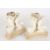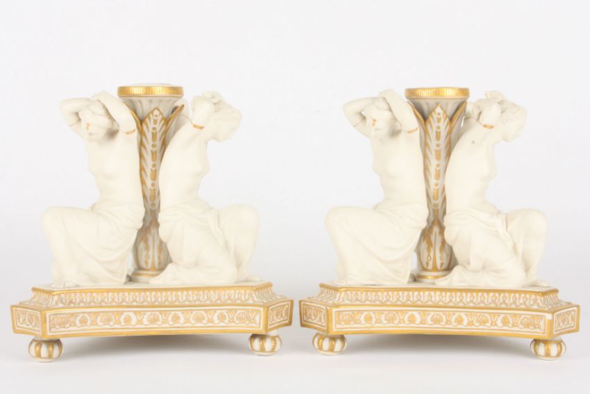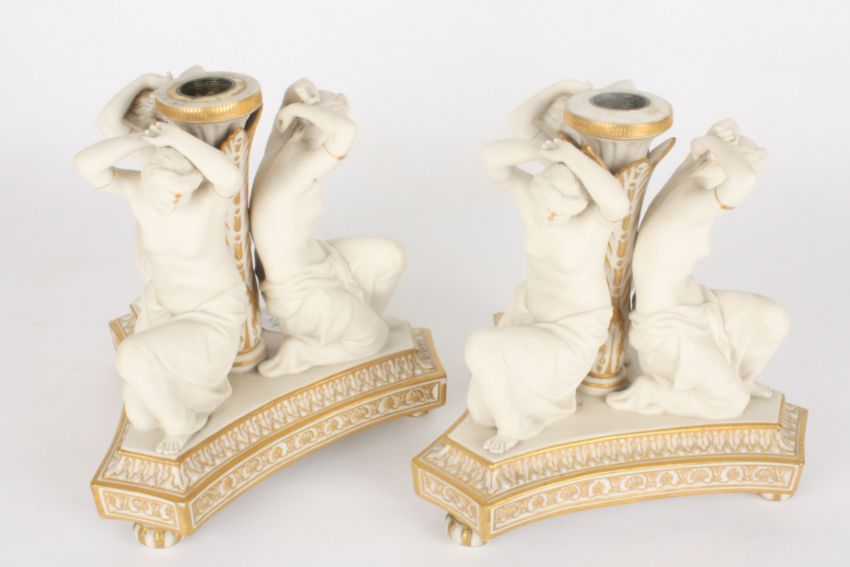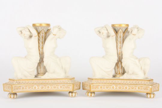 A pair of Victorian Copeland parian three graces candlesticks formed as three kneeling semi-nudes surrounded a central acanthus mounted stem, supported on a moulded triangular concave base with gilt highlights. Impressed marks to base, 19 cm high.Condition: Repairs to feet, two feet missing, one thumb missing, some fingers missing, few other small nicks to the bases.