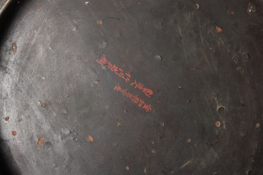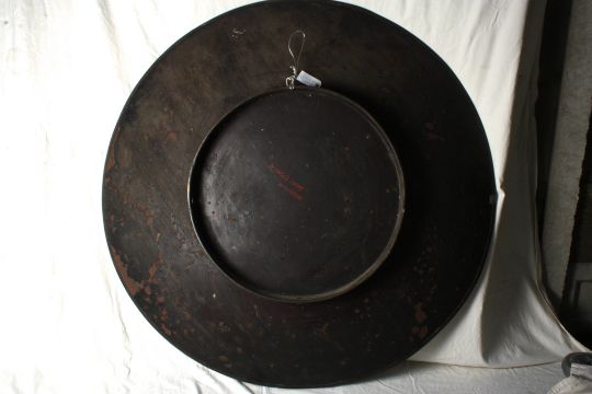 A large Meiji Japanese lacquer and enamel dish signed on the reverse Aichi-Ken Nagoya Seizo-Nin Takeuchi Chebei (Takeuchi Chubei from Nagoya) with gold and silver wire and coloured cloisonné enamels depicting two peacocks amongst a landscape and floral background, 120cm diameterCondition: With chips to the lacquer around the outside and enamel particularly to the edge and the underside