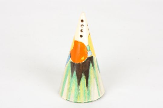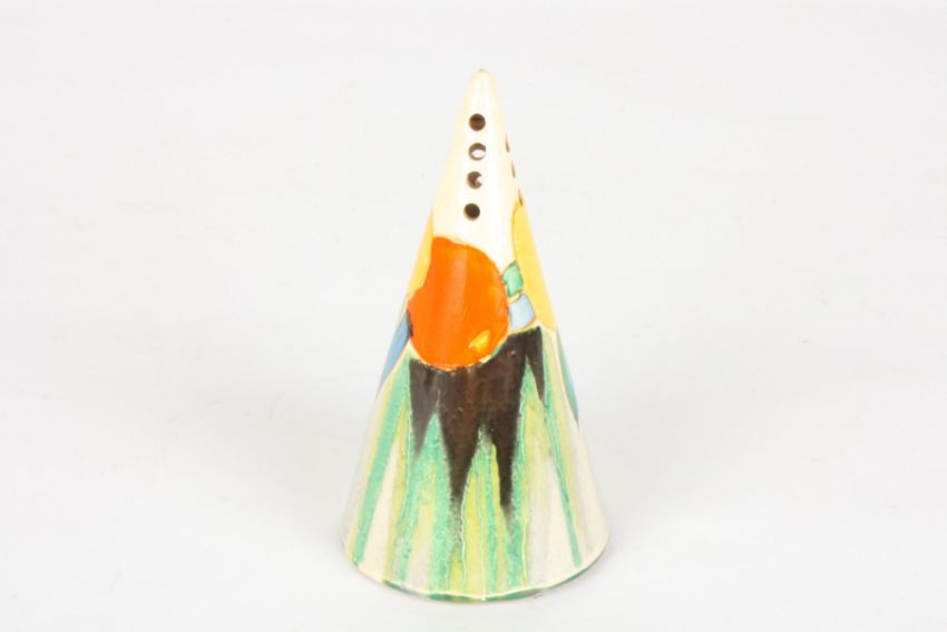 A Clarice Cliff conical sugar shaker - Delicia Citris hand painted band of fruit over a Delicia ground, with Bizarre stamp to underside, height 14cm Condition: With small chip to one of the holes