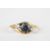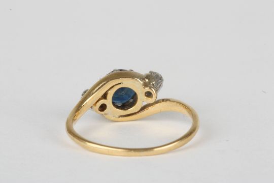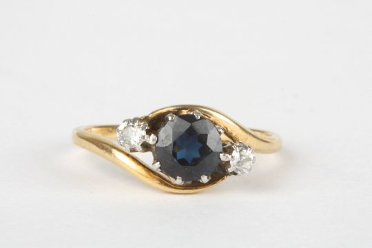 An 18ct gold, sapphire and diamond ring set with large central sapphire, flanked either side by small diamonds weighing approx 0.04cts each, in a spiral mount, Size N. Condition: Good condition
