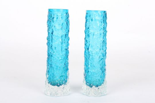 A pair of Whitefriars glass bark spill vases, in Kingfisher blue, of narrow cylindrical form, 14.5 cm high.Condition: Good condition with no damage.