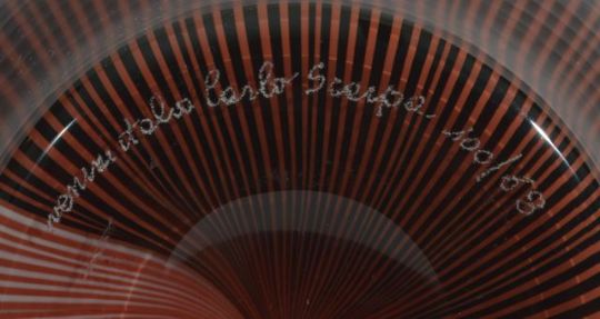 Carlo Scarpa (1906-1978) for Venini 'Tessuti Battuti' coral and red vase with caned decoration, with etched signature venini Italia Carlo Scarpa 100/68, with original sticker, height 32cmCondition: