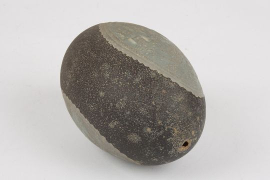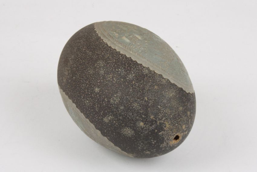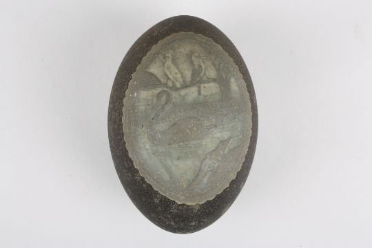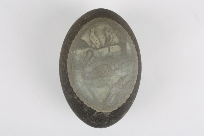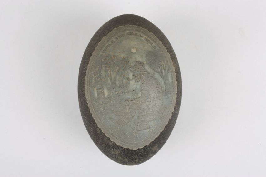 A Victorian carved Emu egg 'While the Billy Boils' decorated with a cameo type scene of a man smoking a pipe and a swan and parrots verso, 13 cm long.Condition: Good condition with light wear, no damage.