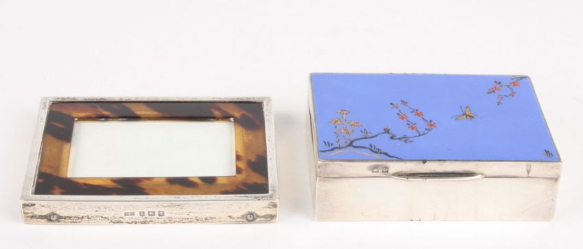 A George V silver and enamel box hallmarked Birmingham 1928, the top decorated with a Chinoisserie scene of a butterfly and flowers on a blue ground, together with a silver and tortoiseshell miniature photograph frame, Box 8.5 cm wide, frame 9 x 7 cm.Condition: Both in good condition.