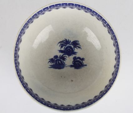 A late 18th century Worcester transfer printed blue and white bowl decorated in the Fisherman and Pleasure Boat pattern, with blue crescent mark to base, 12 cm diameter.Condition: Some wear and crazing to interior, no damage.