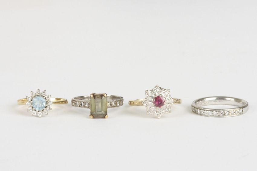 Three 18ct gold dress rings and another including a ruby and diamond ring, an aquamarine and diamond ring, a peridot and diamond ring, and a diamond half eternity ring. (4), Condition: All in good condition.