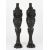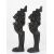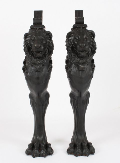 A pair of Victorian design heavy cast iron lion caryatid console supports the lions in black painted finish, with leaves below and supported on heavy paw feet, with wooden top brackets, 79 cm high, excluding wooden brackets.Condition: Both in good condition.