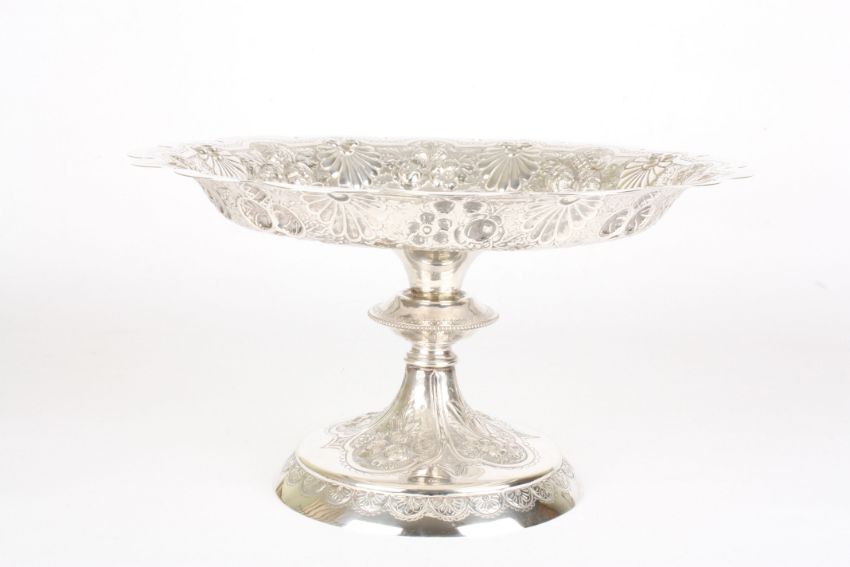 A large Victorian silver salver hallmarked Sheffield 1892, the top with shaped rim, and embossed and engraved with fruit and flowers, supported on a baluster column to a circular foot with further embossed decoration. Makers mark: Walker & Hall, 34.5 ozt. 32 cm diameter, 17.5 cm high.Condition: Good condition, with no damage, although rough solder join on the underside.