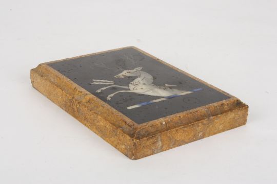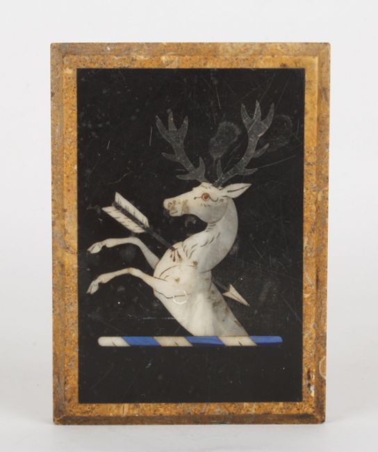 A Victorian pietra dura inlaid marble paperweight decorated with a heraldic crest of a white stag with arrow through it's chest, on a black ground, inset into a Sienna marble block, 14.25 x 10.25 cm.Condition: Good condition with some scratches and age related wear.