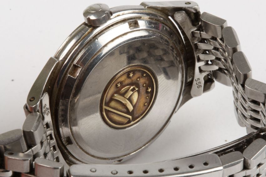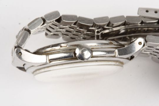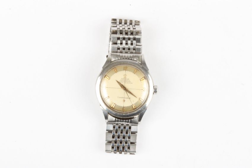 An Omega Constellation stainless steel automatic wrist watch the quartered silvered dial with baton and Arabic numerals, signed Omega Automatic Chronometre Constellation, on a stainless steel link strap, 33 mm case.Condition: Fairly good cosmetic condition, appears to be in working order although movement loose in the case.