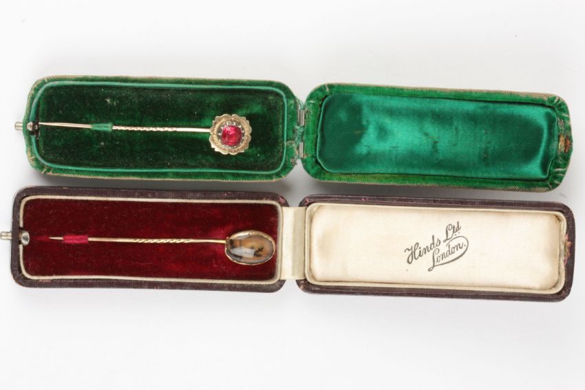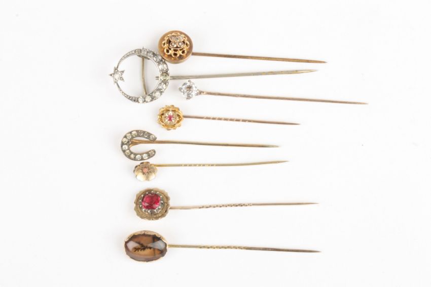 A moss agate and gold tie pie together with seven other tie pins, Condition: Generally in good condition.