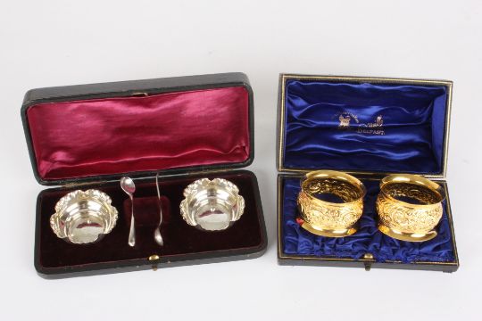 A pair of silver gilt embossed napkin rings, hallmarked Chester 1893, makers mark James Deakin & Sons, in a fitted box from Sharman Neill of Belfast, together with a cased pair of silver salts and spoons, Condition: Good condition with no damage, few minor small dents to napkin ring rims.