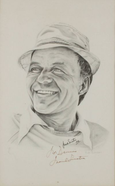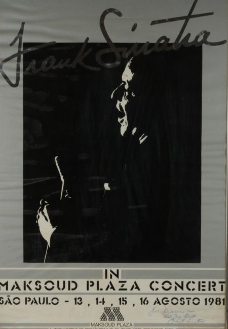 A collection of Frank Sinatra signed and framed pictures comprising: 'La Voz en Argentina', signed, 71 x 52.5 cm; 'Frank Sinatra in Maksoud Plaza Concert Sao Paulo 1981', signed, 63 x 43 cm; a pair of signed black and white prints, 36 x 23 cm; an unsigned concert photo and two loose unframed film posters. (7), Condition: