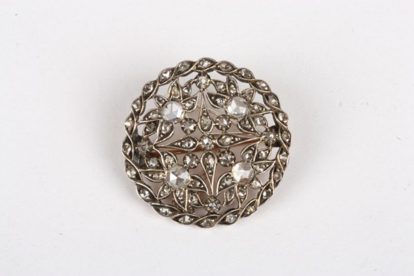 An early 20th century diamond roundel brooch set with four diamonds weighing approx 0.15cts each, with smaller diamonds in a pierced white metal frame, unmarked, 3 cm diameter.Condition: Good condition