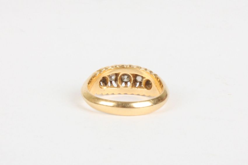 An early 20th century 18ct yellow gold and diamond five stone ring hallmarked Birmingham 1915, the central stone weighing approximately 0.08cts, flanked my smaller graduated stones, Size J. 4.1 grams.Condition: Good condition with no damage.