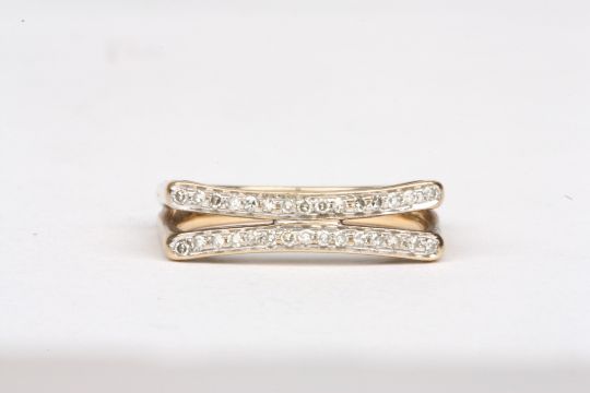 A 9ct gold and diamond split shank ring of squared form set with two rows of small diamonds, marked .375, Size O.Condition: Good condition