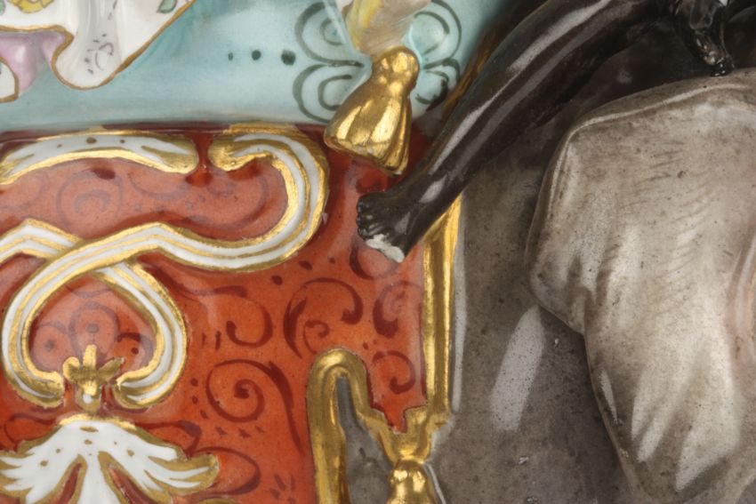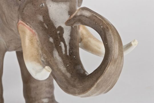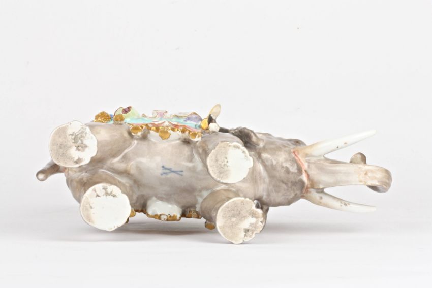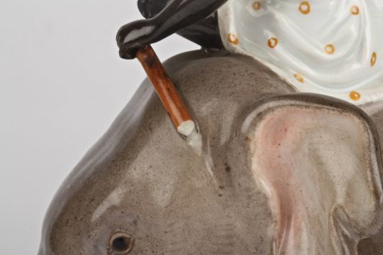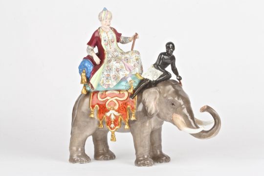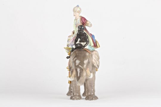 A late 19th century Meissen group of a sultan and black boy riding an elephant after a model by J. J. Kaendler (circa 1748), formed as a sultan seated upon a richly decorated seat, with young black mahoot. Crossed swords mark in blue to underside of elephant, 25 cm high, 26.5 cm long.Condition: Chip to sultans and mahoots staff, chipped tusks, and top of hat. Two chipped tassels and mahoots toes.