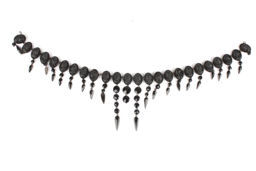 A Victorian French jet cameo collar necklace formed as 24 oval panels decorated with relief portraits of female busts, with facetted beads suspended below, 35 cm long.Condition: Generally good condition, few drops missing.