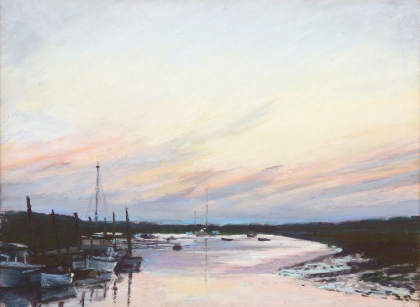 Margaret Glass (b. 1950) 'After Sunset Blakeney', an estuary scene with boats. Pastel, unsigned, original artists label verso. Framed and mounted, 16 x 21.5 cm.Condition: Good condition
