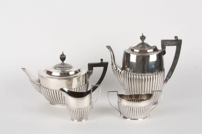 A contemporary silver four piece tea and coffee set hallmarked Sheffield 1992, formed with tapering semi-gadrooned bodies, and ebonised handles and knops. Makers marks: James Dixon & Sons, 52.7 ozt. including handles.Condition: Appears in good condition.