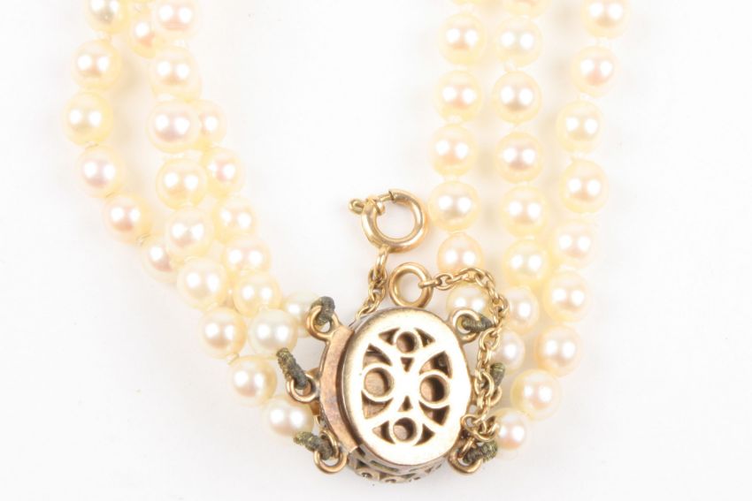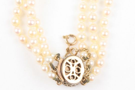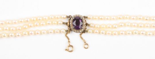 A triple row graduated cultured pearl necklace the 3.5mm to 8mm pearls of uniform colour and strung from a yellow metal, amethyst and diamond clasp, 46.6 cm long. Pearls 3.5-8mm.Condition: Appears in good condition.
