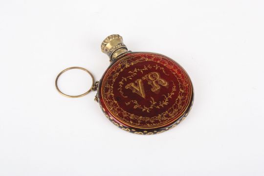A small Victorian red glass scent bottle with gilt metal lid, the body with gilt decoration and VR monogram, 6.75 cm long.Condition: Good condition with minor wear, lacking stopper.