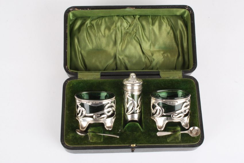 An Edwardian Art Nouveau silver and green glass cruet set hallmarked Birmingham 1906, of pierced and scrolled foliate form, with green glass liners. Makers mark: Levi & Salaman. With spoons in a fitted box, Condition: Generally good condition, with no damage.