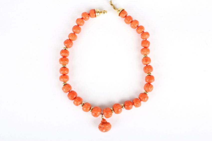 A set of Chinese carved coral beads each bead carved in the form of a fruit bat, with a carved pendant in the form of a Buddha, with gold coloured metal spacers and clasp (unmarked but probably gold), overall length 39.5cmCondition: The pendant with some minor white spotting to reverse and underside. Generally all beads in good to fair condition