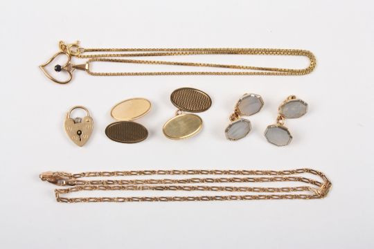A small group of gold jewellery comprising two 9ct gold chains, a 9ct heart shaped padlock clasp, a pair of 9ct oval cufflinks and a pair of 18ct and platinum octagonal cufflinks inset with mother of pearl, 9ct: 19 grams, 18ct 5.8 grams.Condition: