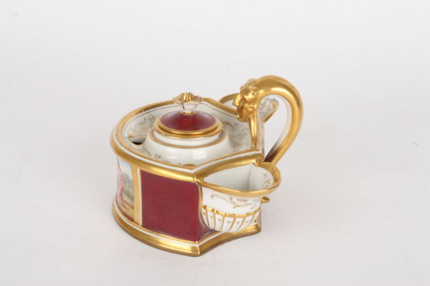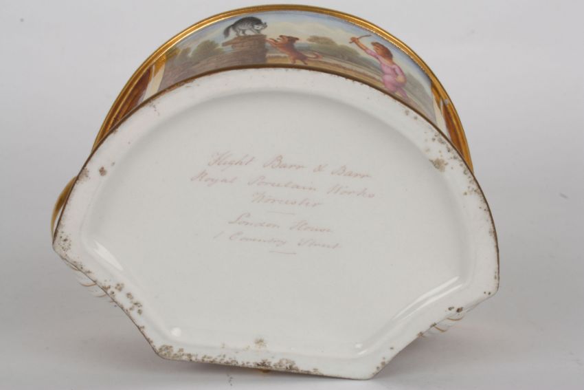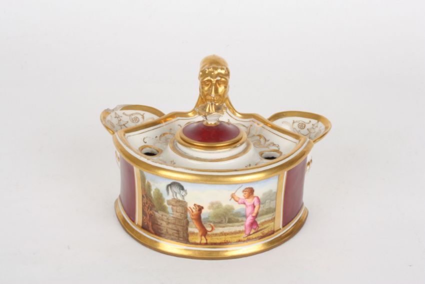 An early 19th century Royal Worcester Flight Barr & Barr porcelain inkwell with central lidded inkwell and gilt handle, flanked by pen dips, painted with a panel of a boy with dog scaring a cat, on a purple ground with rich gilt highlights, the base inscribed 'Flight Barr & Barr Royal Porcelain Works Worcester, London House, 1 Coventry Street', 14 cm wide.Condition: Chip to lip of one pen dip, few other small nicks but no major damage.