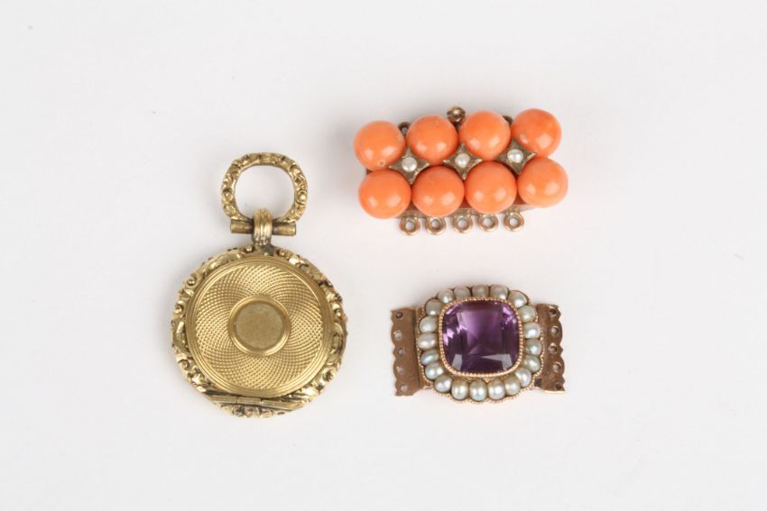 A Georgian amethyst and seed pearl clasp, together with a coral and seed pearl clasp and a small gilt metal locket. (3), Condition: All in good condition.